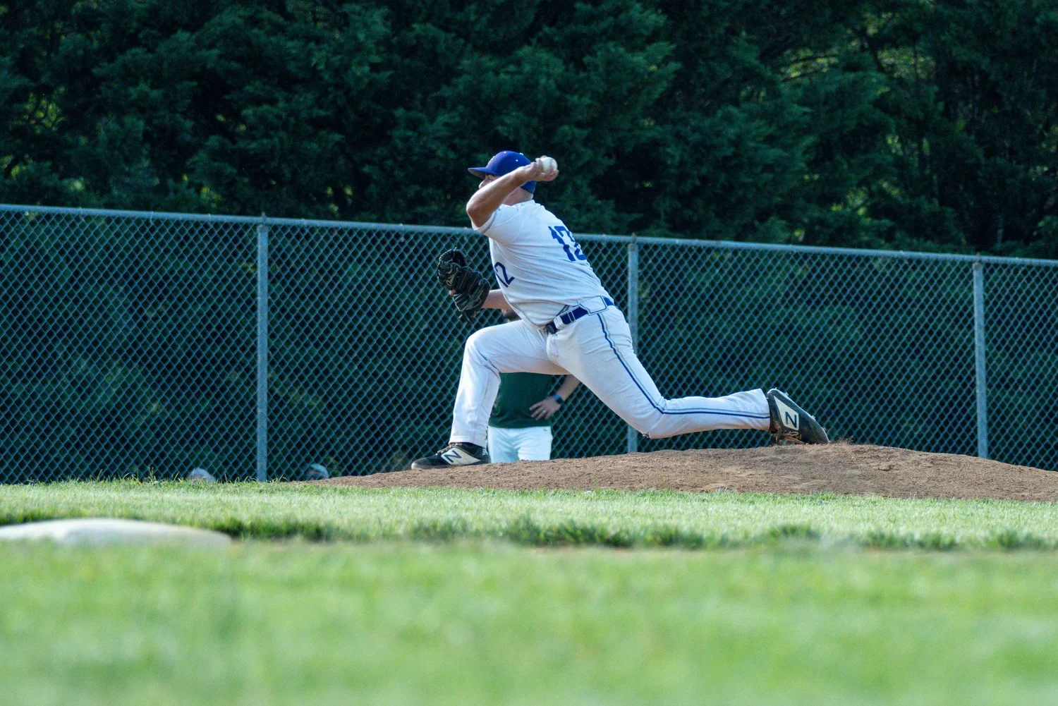 Balance at Front Foot Strike: The front foot lands before significant upper body rotation begins, which is correct sequencing. However, the landing is not completely stable. Due to the lateral pull of the upper body, the pitcher's momentum carries him towards the first base side immediately upon landing, compromising a stable foundation.